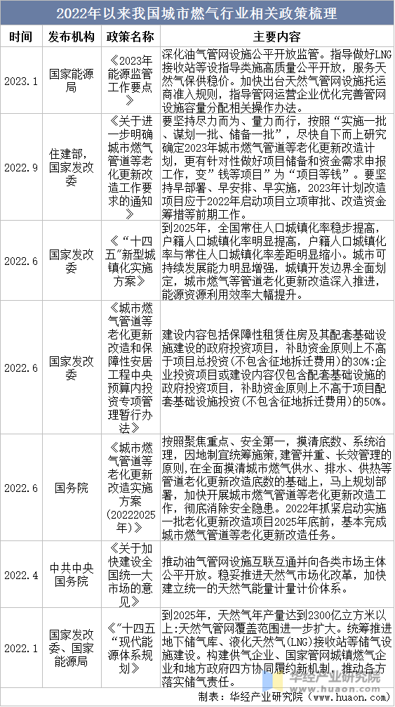 本文节选自华经财产研究院发布的《2023年中国城市燃气行业市场现状及合作款式阐发,普及程度进一步提拔「图」》,如需获取全文内容,可进入华经谍报网搜刮查看。近年来,我国出台了多项城市燃气出产和供应支撑政策,加速成长扶植天然气油气管道扶植。国务院发布《城市燃气管道等老化更新实施方案(2022-2025年)》,我国正在“十四五”期间将沉点开展城市燃气管道老化更新工做。截至2023年3月,城市燃气出产和供应相关政策汇总如下: